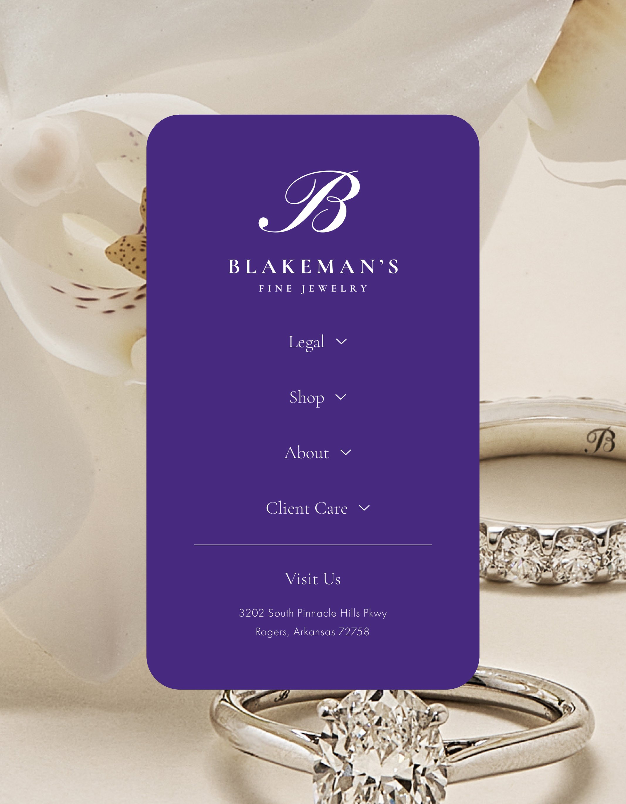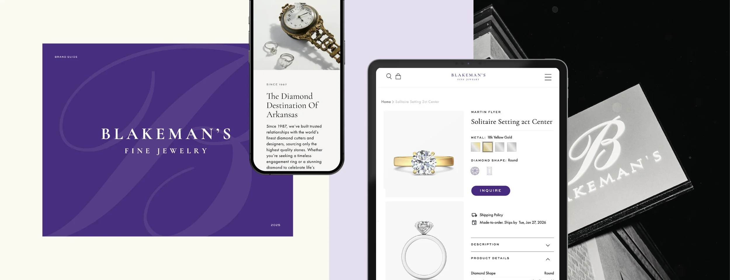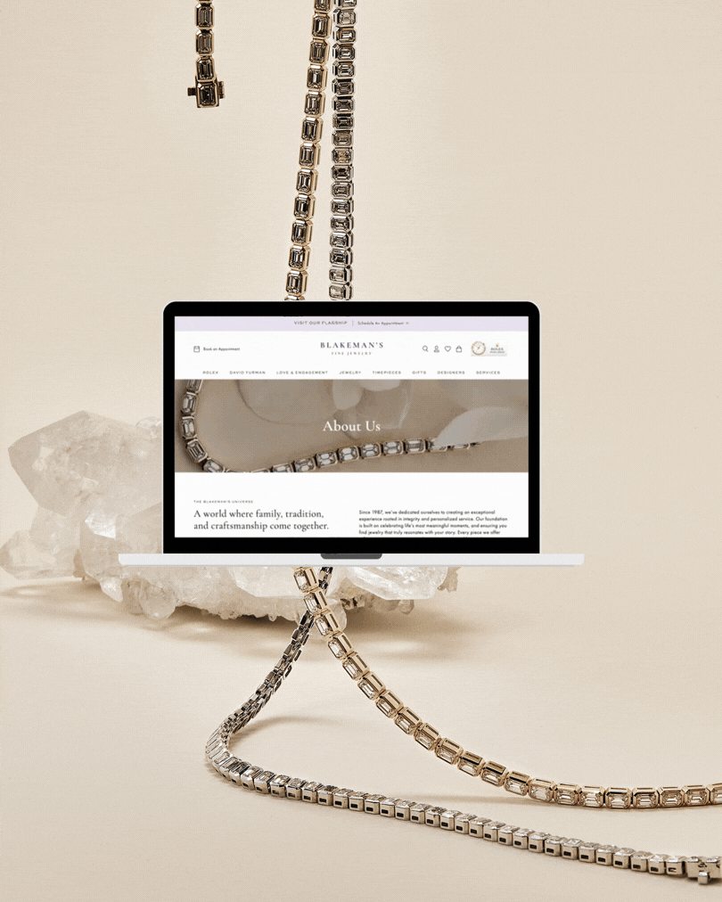 Ahead of their grand re-opening, Blakeman's Fine Jewelry was ready to step into the next phase of their legacy. As the premiere jewelry destination in Northwest Arkansas, a high-touch, client-first experience was the priority. We worked together to craft the next iteration of their legacy brand, a fully custom webssite with a first-class online shopping experience, and a host of digital and physical collateral to create an elevated, on-brand experience at every touch point.