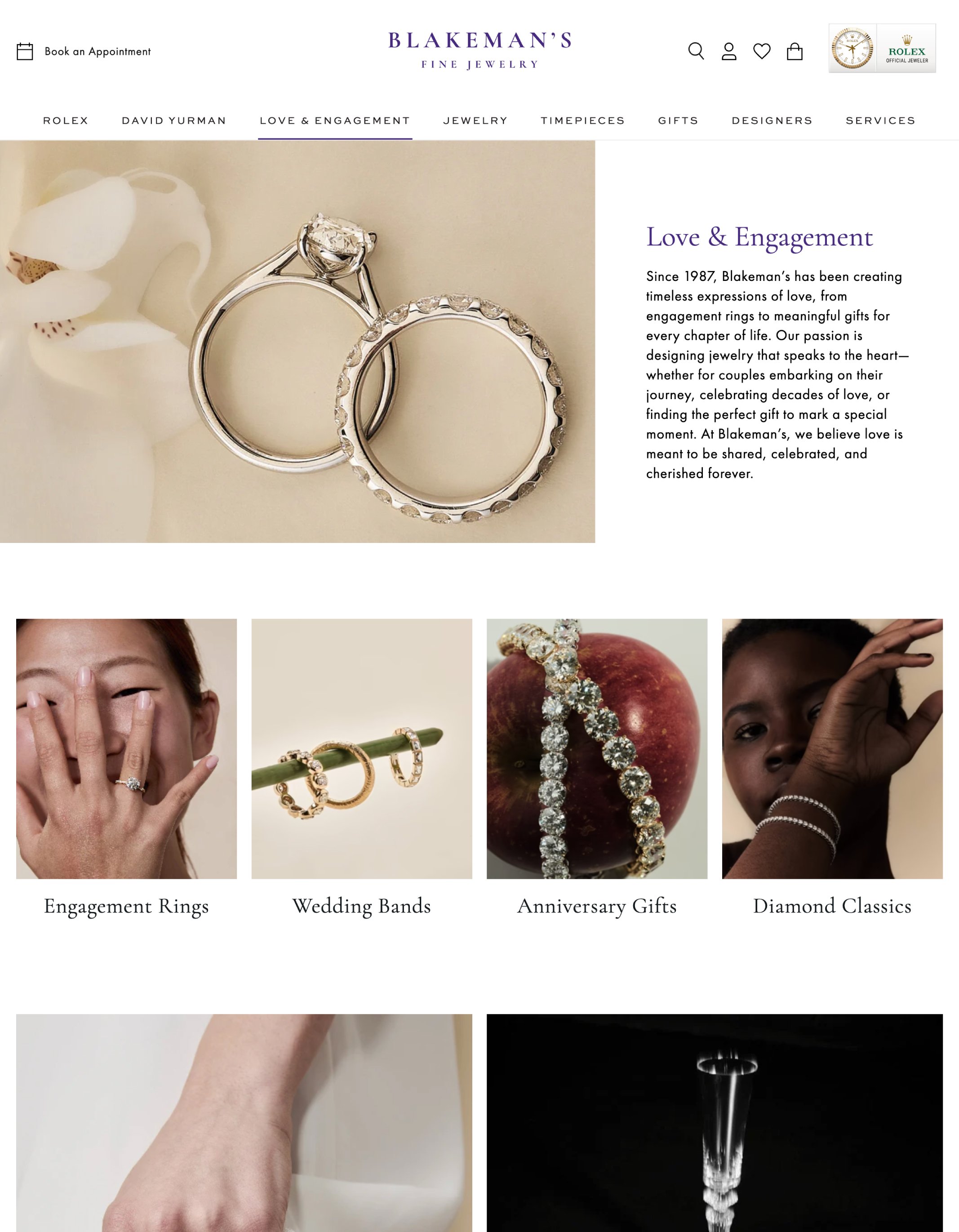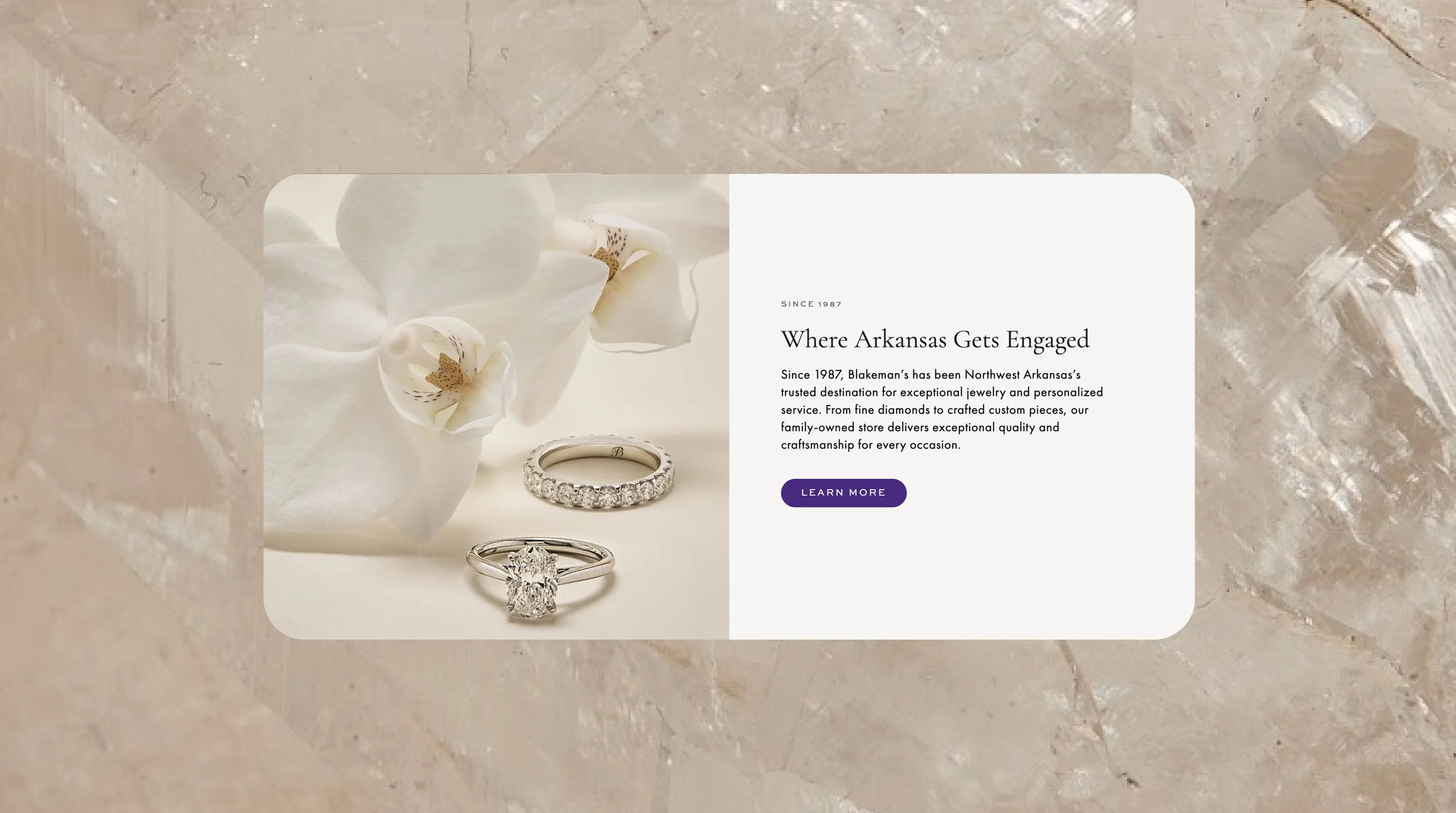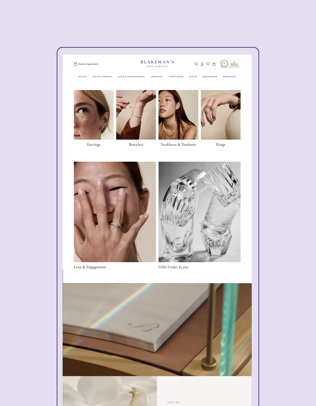 Ahead of their grand re-opening, Blakeman's Fine Jewelry was ready to step into the next phase of their legacy. As the premiere jewelry destination in Northwest Arkansas, a high-touch, client-first experience was the priority. We worked together to craft the next iteration of their legacy brand, a fully custom webssite with a first-class online shopping experience, and a host of digital and physical collateral to create an elevated, on-brand experience at every touch point.